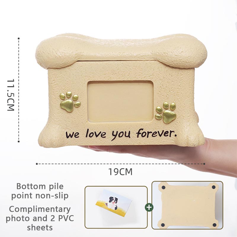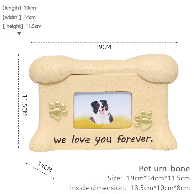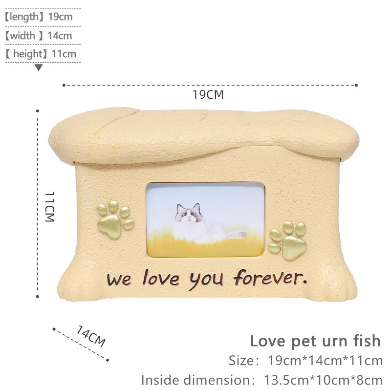 स्तंभ आणि आतील बॉक्सच्या शरीराच्या बाहेरील दरम्यान एक अंतर असू शकते; कलश ठेवण्यासाठी वापरलेला बाह्य सजावटीचा ब्लॉक चित्र फ्रेमसह संपूर्ण राळ पाळीव प्राण्यांच्या मेमोरियल कलशचे स्वरूप वाढविण्यात आणि त्यास अधिक सुंदर बनविण्यात मदत करते.